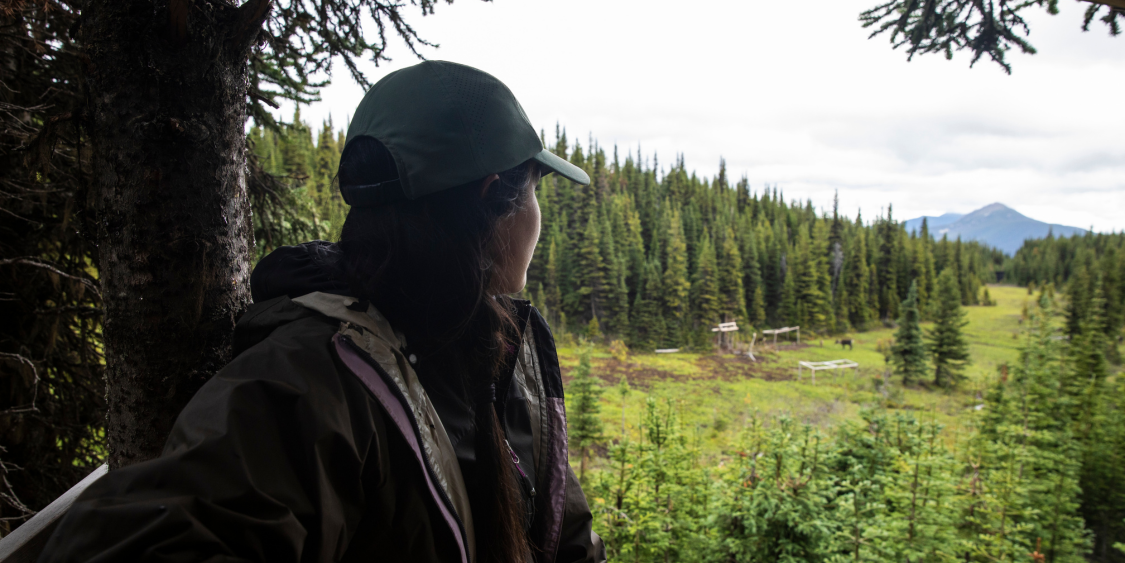 Starr Gauthier, member of the Saulteau First Nations and Caribou Guardian, looks out at caribou recovery in the caribou maternal pen — part of the Indigenous-led efforts to recover the Klinse-za caribou herd. Photo credit: David Moskowitz.