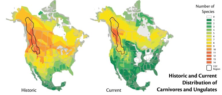 The Yellowstone to Yukon region (outlined in black, above) remains a stronghold for large ungulates, such as elk and moose, and carnivores, including bear, lynx and wolverine.